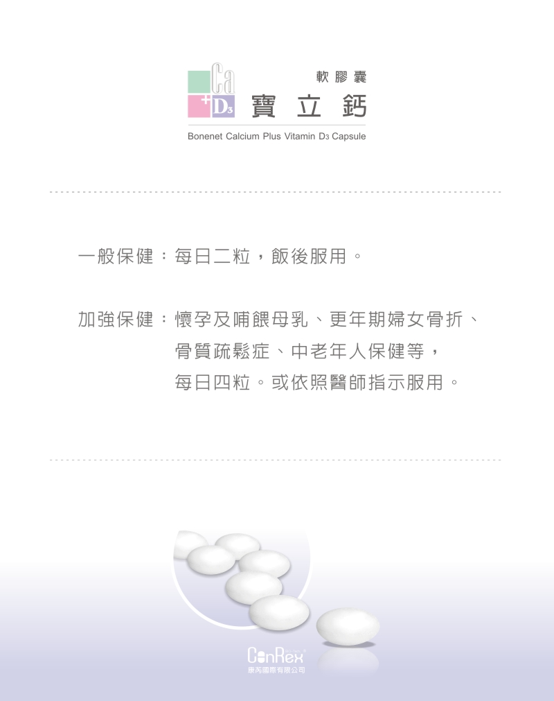 採用軟膠囊劑型,與一般硬錠型鈣片不同,無需嚼碎,且不會產生胃痛、便祕、結石等現象。